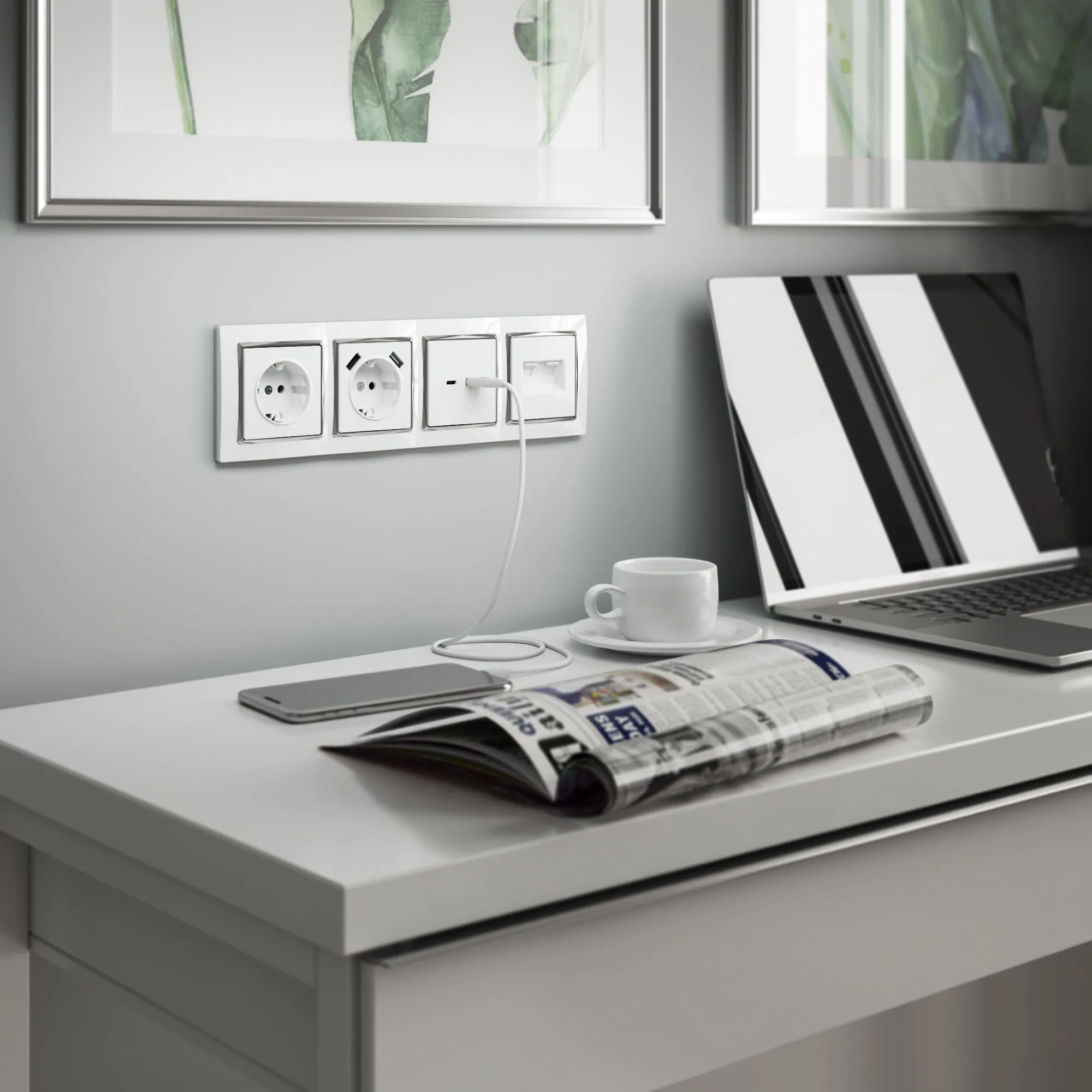 Интернет-розетка двойная совместима со всеми рамками коллекции Werkel, что позволяет создавать разнообразные цветовые и стилистические комбинации, подходящие под современные интерьеры.